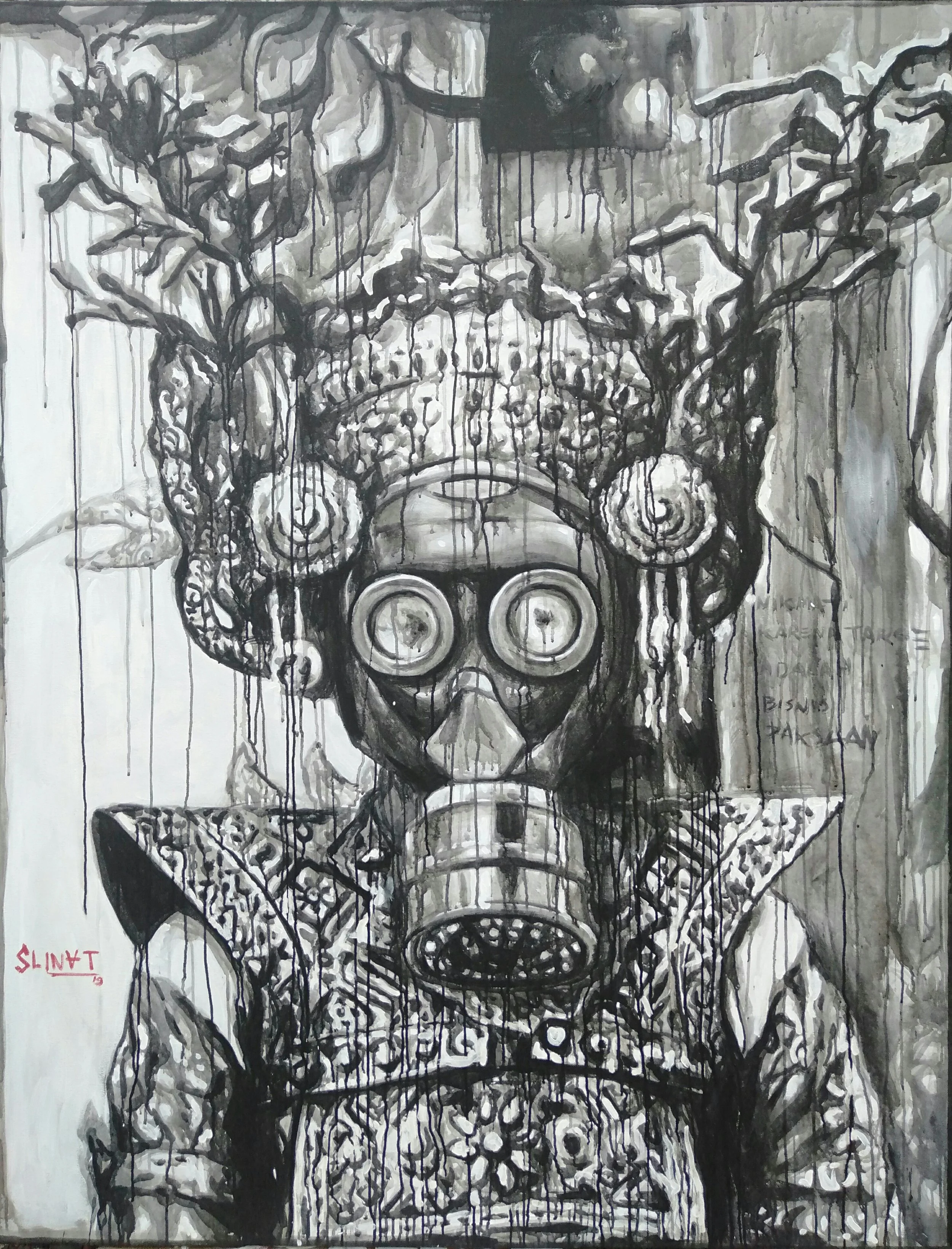 Slinat, Legong In Pose, Chatkoal ink, tobacco on canvas, 140x180cm, 2019.