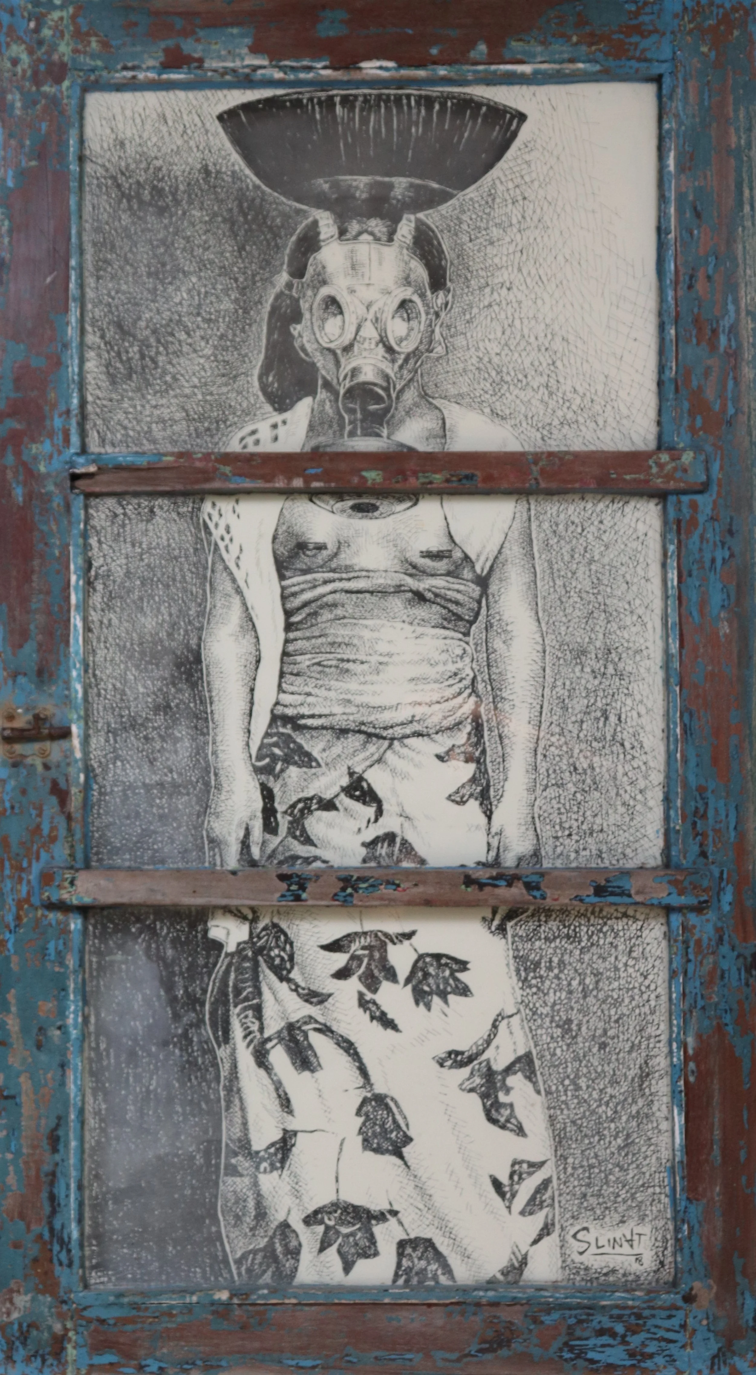 Slinat Gadis Bali Membawa Keben, 62,5x112cm, Acrili on glas window, 2018.