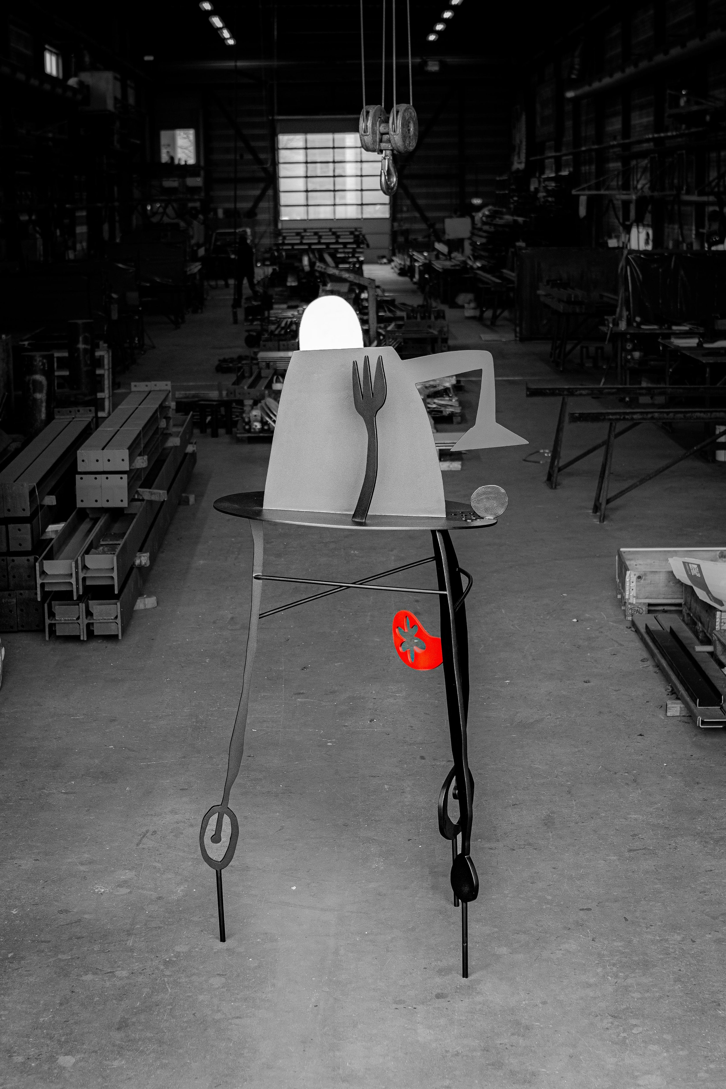 The sculptures retain the emotional immediacy and playfulness that define his earlier work, yet they now carry a heightened sense of material authority and spatial awareness. Rendered in stainless steel, the figures possess both strength and vulnerability: industrial in construction, poetic in gesture. The line — once illustrative — is transformed into structure, turning drawing into architecture and gesture into volume.