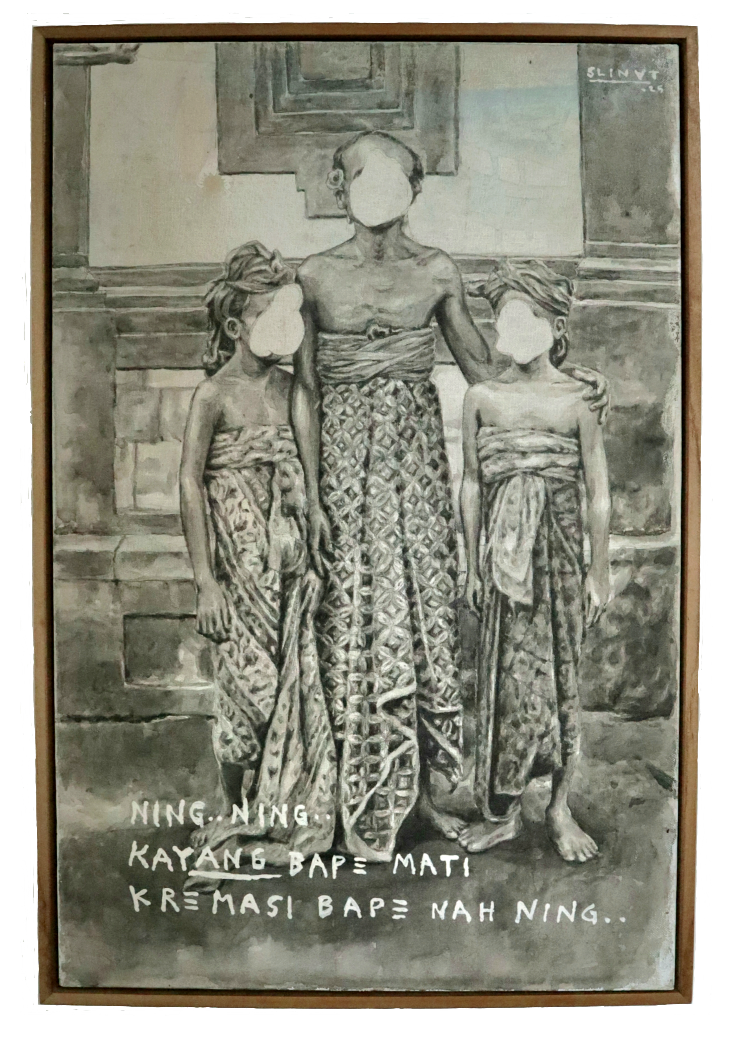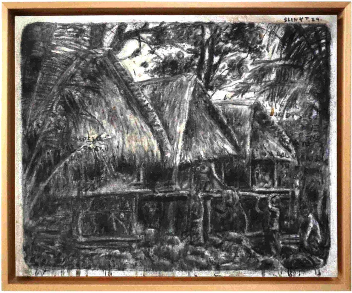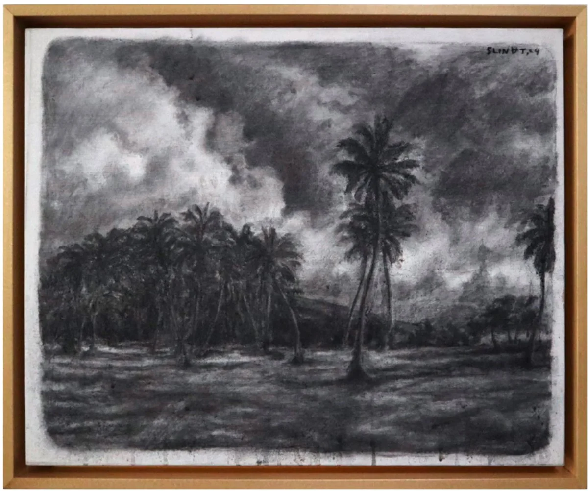 His practice is deeply rooted in the Balinese traditional Sigar Mangsi technique a layered charcoal method historically used in Wayang painting. By embedding this ancestral method within a critical contemporary narrative, Slinat bridges ritual and resistance, tradition and transformation.